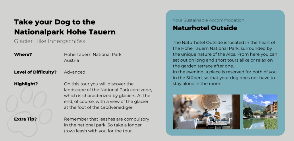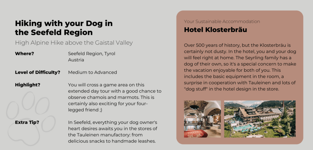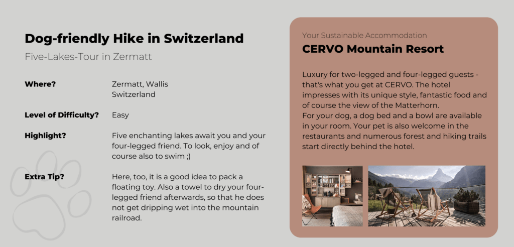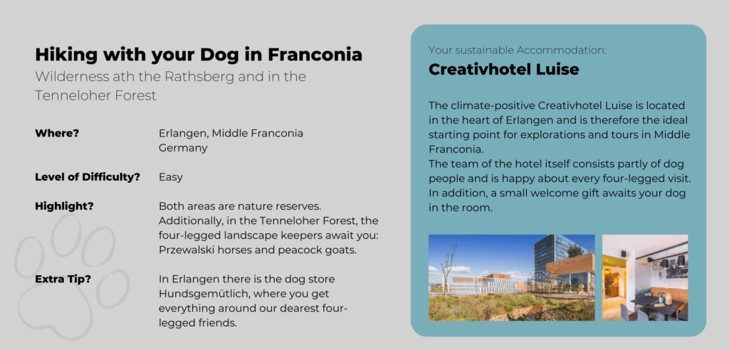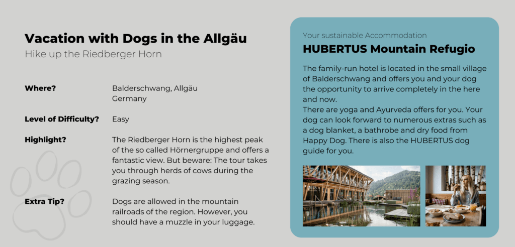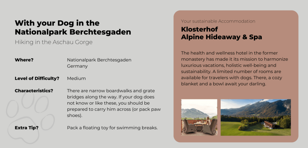 Hiking with your Dog: Our favourite Trails and dog-friendly Hotels in the European Alps Marilou Cabatingan, 07/10/202308/27/2025 Imagine standing at the top of a mountain, taking in the magnificent panorama around you and savouring the moment. Next to you is your four-legged friend, who is also looking out over the mountains, panting, but with a twinkle in his eye. Together you have conquered this peak. And now you are both looking forward to a snack. That’s the beauty of hiking with dogs. With your four-legged best friend, you share the joy (and the exertion). From the mountains to the plains, dog walking is possible everywhere. These are our favourite walks in southern Germany, Austria and Switzerland. So it’ll be mountainous 😉 But don’t worry – you don’t need any special equipment or the stamina of a marathon runner for most of the routes. However, both you and your dog should be sure-footed and fit. Mountain Hiking with your Dog: What to consider beforehand Many nature reserves and national parks are in or near popular holiday destinations. It’s a good idea to find out in advance what rules you will need to comply with. In general, you can assume that you will need to keep your dog leashed. This is to prevent your dog from frightening the wildlife and to prevent it from frightening other walkers (who may be afraid of dogs). In addition, you should be on the lookout for dog foul. Dog excrement, especially in large quantities, can have a harmful effect on the environment, particularly on groundwater quality. On mountain pastures, dog excrement can also contaminate the hay. This can make the animals sick. Pregnant cows are particularly at risk. Dogs carry a pathogen that can cause miscarriages. In the Alps, too, it is possible for hiking trails to take you right through the middle of herds of cows. There are certain rules of behaviour to follow to avoid injury to you and your dog. Cows, in particular, can become very aggressive if they feel their calves are threatened. Now, before we take you on some of our favourite walks, here’s a summary of what you should take with you on a trip. In the summer and in the winter. The Alps are a great place for winter walks too. However, it is important to check which paths are passable beforehand. If you don’t have any (alpine) experience, choose easier and shorter routes. Summer Hiking in the Mountains with your Dog: This is what you need Bring enough water for you and him (check where you plan to go first. There may be water sources. But don’t rely on them, especially in summer). A collapsible water bowl for your dog, which can easily be attached to the outside of your rucksack. Snacks for you and your dog, depending on how far you’re going, to keep you going 😉 A bag for dog waste and a bag for rubbish A small towel to dry your feet and possibly your dog if you have cooled off in a mountain stream. Also handy if you’ve been in a downpour and your dog gets cold quickly. A good dog harness to help your dog through difficult passages, possibly with a handle. And, of course, a lead and collar if necessary. A muzzle, if you are planning to take the cable car or use public transport. Blanket or cushion to rest on First aid kit, tick tweezers, disinfectant spray A Winter Hike with your Dog in the Mountains: What you will need as well Insulated bottle so the water doesn’t get cold or freeze. Insulation mat for you and your dog during breaks. Paw pads to protect your dog from salt and grit in towns and on busy paths. Vaseline or similar to prevent snow from sticking to the pads of long-haired dogs. Our favourite Hikes for Holidays with Dogs in Germany The Wilderness of Rathsberg and Tenneloher Forst – Hiking with dogs in Franconia Tour 1 – Wilderness on the Rathsberg North of Erlangen is the primeval forest around Rathsberg. The gorge forest consists of ancient maple and ash trees, steep slopes and many springs and streams. It is a paradise for small animals of all kinds! Time and time again, you will see sandstone rocks jutting out next to the paths. In general, the paths are natural and can really be described as forest paths. So it can get muddy after rain. But there are lots of forest smells that your dog will love. That’s a promise! Tour 2 – Tenneloher Forest On a former military site, the Tenneloher Forst nature reserve covers 936 hectares. It is one of the last large sand ecosystems in southern Germany. It has a steppe-like appearance. To preserve this, wild horses and peacock goats graze the areas to prevent them from becoming overgrown. It is safe to have a walk around the horse and goat enclosures. Due to the danger of ammunition in the rest of Tenneloher Forest, it is best to stay on the gravel paths. By the way: The Tennenlohe Forest Adventure Centre offers special events and guided tours for children and adults throughout the year. There is also a nature trail. Hiking with a Dog in Berchtesgaden National Park – The Aschau Gorge Hike through the Aschau Gorge The famous gorges in the Berchtesgaden National Park, such as the Almbach Gorge or the Wimbach Gorge, can get pretty crowded in the summer. Although we highly recommend the walks there, you and your dog may be more attracted to less crowded areas in the summer. If so, the Aschauer Klamm is for you. The nine-kilometer walk gives you and your dog plenty of opportunities to cool off, and it’s generally not as oppressively hot inside the gorge as it is outside. Bear in mind, however, that there are some tricky passages where you may need to support your dog, especially if he tends to be clumsy. Wooden bridges and grating bridges without railings can be challenging. Gratings are particularly uncomfortable for dogs’ paws. Some dogs don’t mind at all, but there are more sensitive candidates. If you want to see how they cope with tight corners and uneven surfaces, the Aschauer Klamm is a great training route. A perfect preparation for longer trips 😉 H
